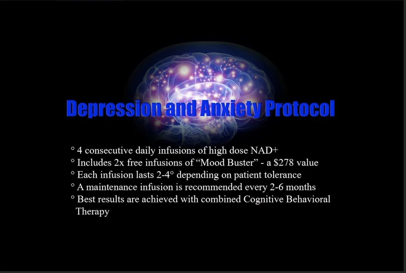 We offer single dose luxury infusions as well as discounted comprehensive protocols for the adjunctive treatment of antiaging and overall wellness, neurocognitive function, mood disorders, Lyme disease recovery and addiction. The best results are achieved with 4+ consecutive infusions followed by maintenance doses every 2-6 months. All infusions take 2-4 hours depending on patient tolerance.